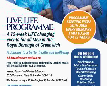 12 Weeks – LIVE LIFE Project which focuses on men’s mental and physical wellbeing. This project starts 12 weeks – 20th June 2022 to 5th September 2022 Men’s Wellbeing: Live Life Program Held at multiple location in Greenwich – Plumstead Library and Woolwich Library / Town Centre (232 Plumstead High Street, London SE18 1JL and 35 Wellington Street, Woolwich, London SE18 6HQ). This program focuses mainly on MEN’s Health and Wellbeing, there were various awareness workshops, physical activities such as boxing, running, walking, social events, health and nutrition classes, games and group and one to one session to tackle social.